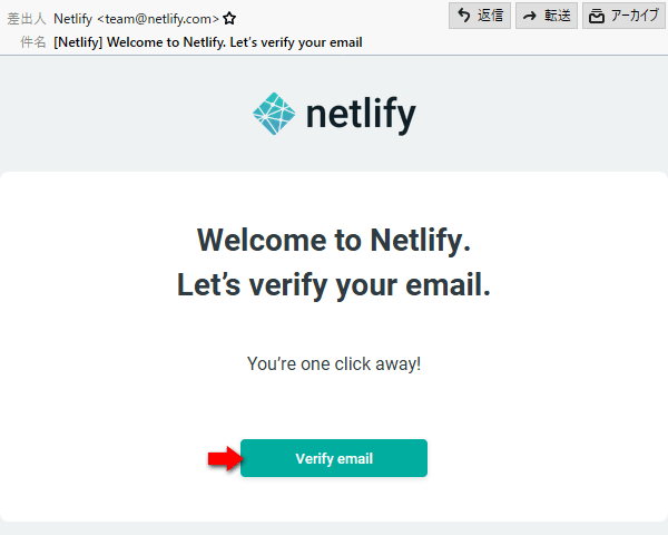 登録したメールアドレスのメールの受信トレイを確認しましょう。Welcome to Netlify. Let’s verify your emal というメールが届いているはずです。メール本文の Verify email をクリックすれば登録完了です。