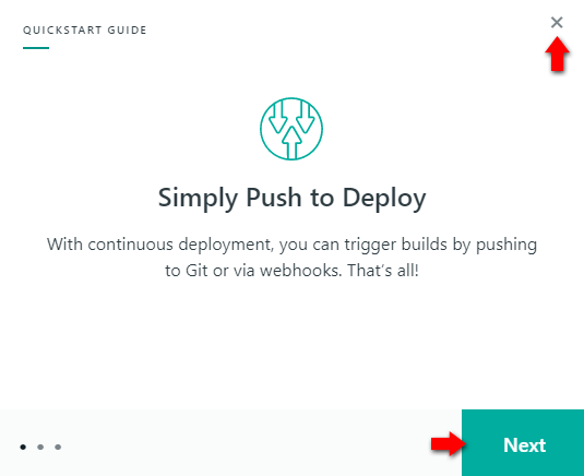 QUICKSTART GUIDE は Next をクリックして読み進めていくか、 もしくは右上の×ボタンをクリックして閉じることもできます。