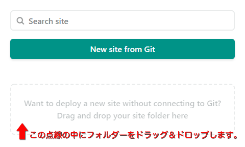 管理ページの 「Want to deploy a new site without connectiong Git? Drag and drop your site folder here」 と書かれている部分にフォルダーをドラッグ&ドロップすると新しいサイトを作成することができます。