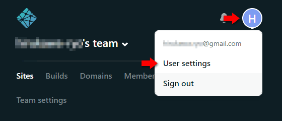Netlify の管理ページ右上のユーザーアイコンをクリックして User settings を選択します。