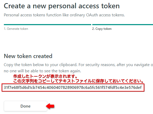 作成したトークンが表示されます。画面に表示されているトークン文字列をコピーしてテキストファイルに保存してください。トークン文字列を保存したら Done をクリックします。