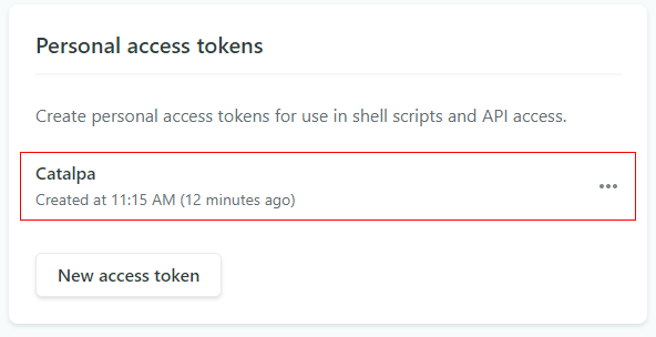 Personal access tokens の一覧に作成したトークンの名前が表示されていれば OK です。(ここではトークンの名前を 「Catalpa」 としました。)