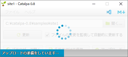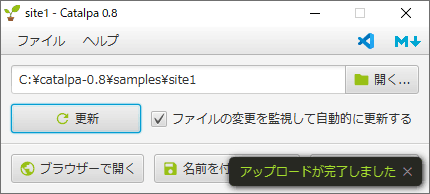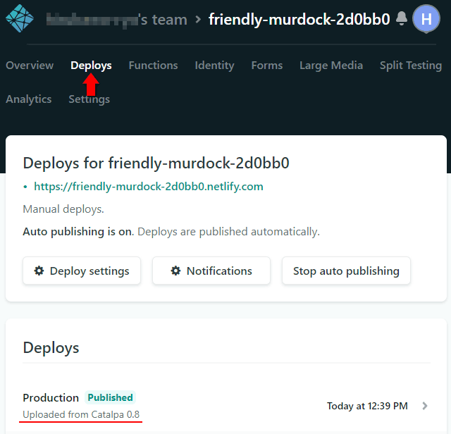 Netlify の管理ページから Deploys を開くと状況を確認できます。下部の一覧に Uploaded from Catalpa 0.8 と表示されてますね。