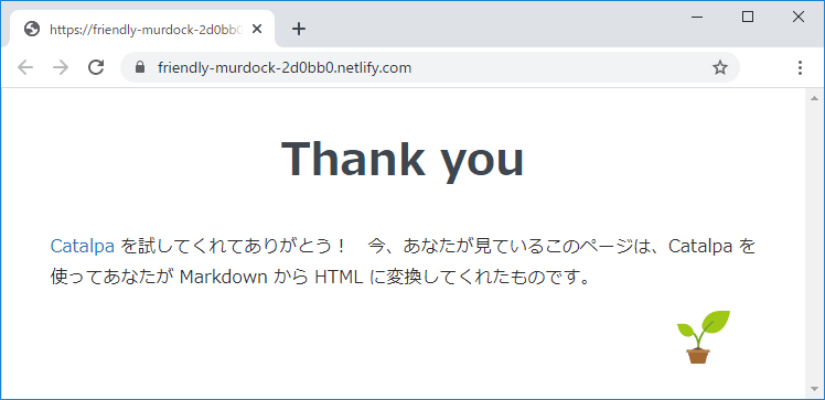 Netlify で割り当てられた URL をブラウザーで開くと Catalpa でアップロードしたサイトがちゃんと表示されます。
